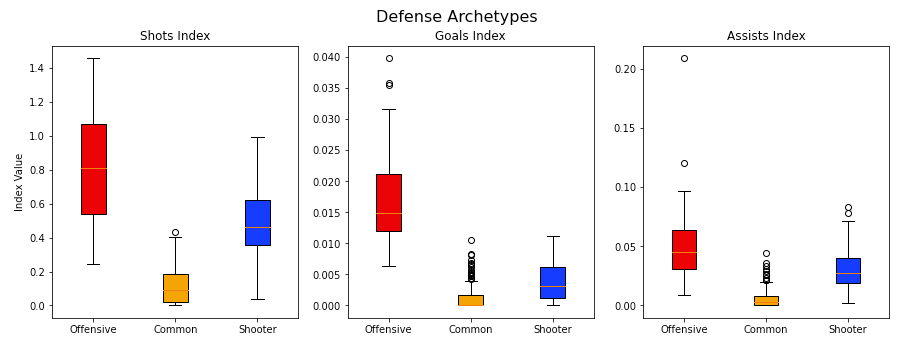 Similarly for the defensemen, there are players that have higher indices across the board. These will be named as “Offensive” types and include players like Victor Hedman and Roman Josi. Of the remaining two types there is one that has significantly higher shots index. This will be named a “Shooter” type, with examples such as Miro Heiskanan and Alex Pietrangelo. The final type will be “Common” and include players like Jack Johnson and Victor Mete.