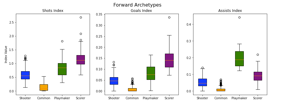The clustering has brought insights into how these players contribute to their teams. The lack of Common players, which do not have standout shot, goals or assists index shows that they do not contribute on the scoresheet (likely some other index would be needed to see their contributions). Furthermore, it can be seen which players contribute more on scoring versus playmaking. This classification can be used as another tool for evaluating player fit for rosters and really looking into how a player contributes to a team.