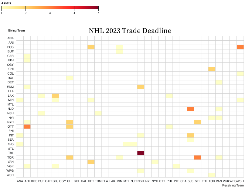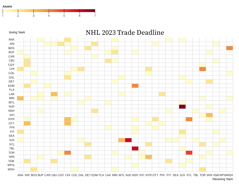 I wanted the visualization provide a general idea of how many assets teams received versus how many assets they shipped out. I also wanted to track which teams made trades and how many assets were involved between any two teams (or three teams in some cases). To that end, I felt a heatmap would provide the easiest way to digest this information. I compiled the data for this visualization myself using various online sources. I considered all trades starting with Bo Horvat’s move from Vancouver to New York on January 30th up to the trade deadline on March 3rd at 12:00 PM Eastern.